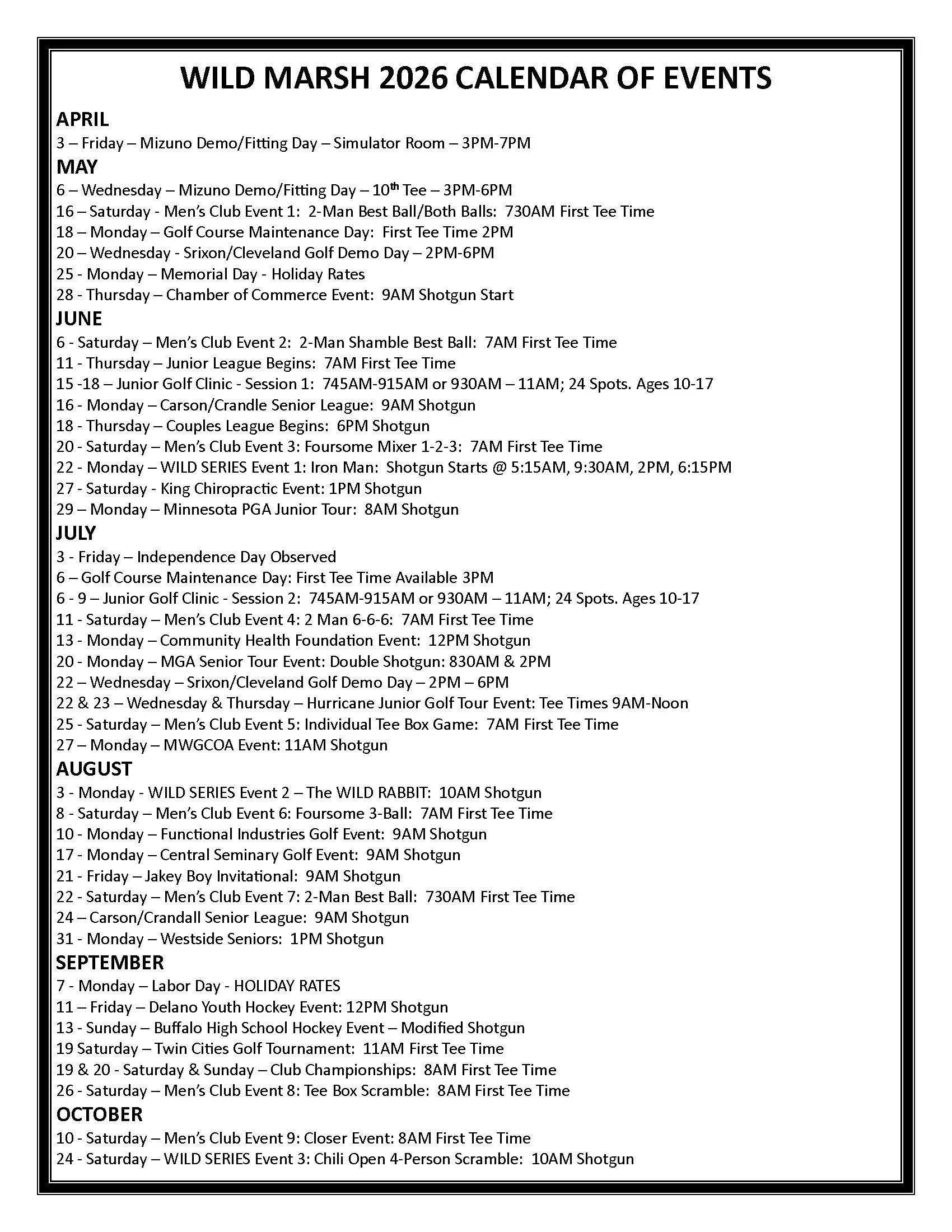 Want to Know What Is Going On At Wild Marsh This Golf Season. Here Is The Current Calendar of Events.